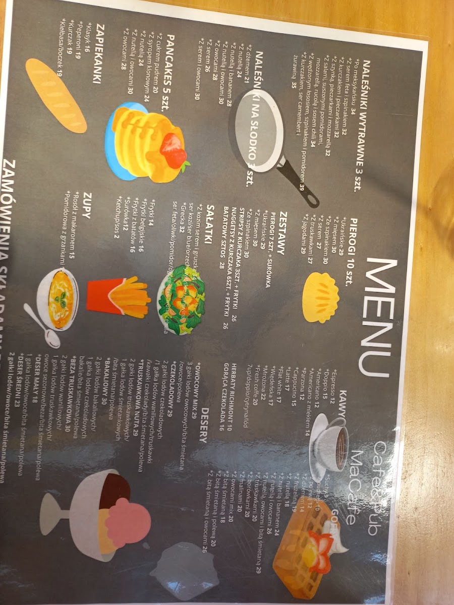 Welcome to Kawiarnia Macafe, a delightful café nestled in Wicie, Poland. Known for its charming atmosphere and friendly service, this café is perfect for beachgoers looking for a satisfying meal. The menu boasts a variety of options that cater to all tastes, from hearty Schwenegulasch served with crispy potato pancakes to indulgent nutella pancakes. Meat lovers will enjoy the mouthwatering burgers, while vegetarians can savor the savory spinach and feta crepes.